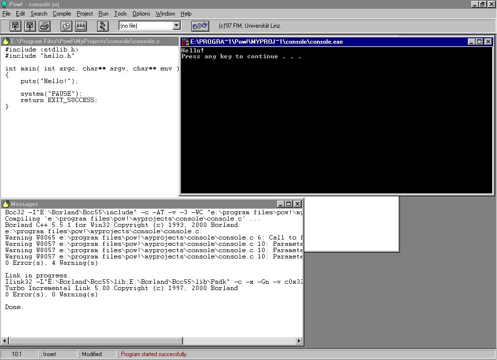 Here's a screenshot of the POW! compiling a console.c program and executing it.