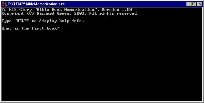 NOTE: I've converted To HIS Glory "Bible Book Memorization" to Java and working on converting To HIS Glory "Bible Verses Memorization, for CBI's BD-101" and To HIS Glory "Flashcards" to Java. Java is a multi-platform language; enabling others (i.e. Apple, Linux, Unix, Windows, ... users) to use these programs. There are other benefits from a programming standpoint also. Soon, I'll leave links to instruct on downloading Java for your operating system; if not already installed on your system.
